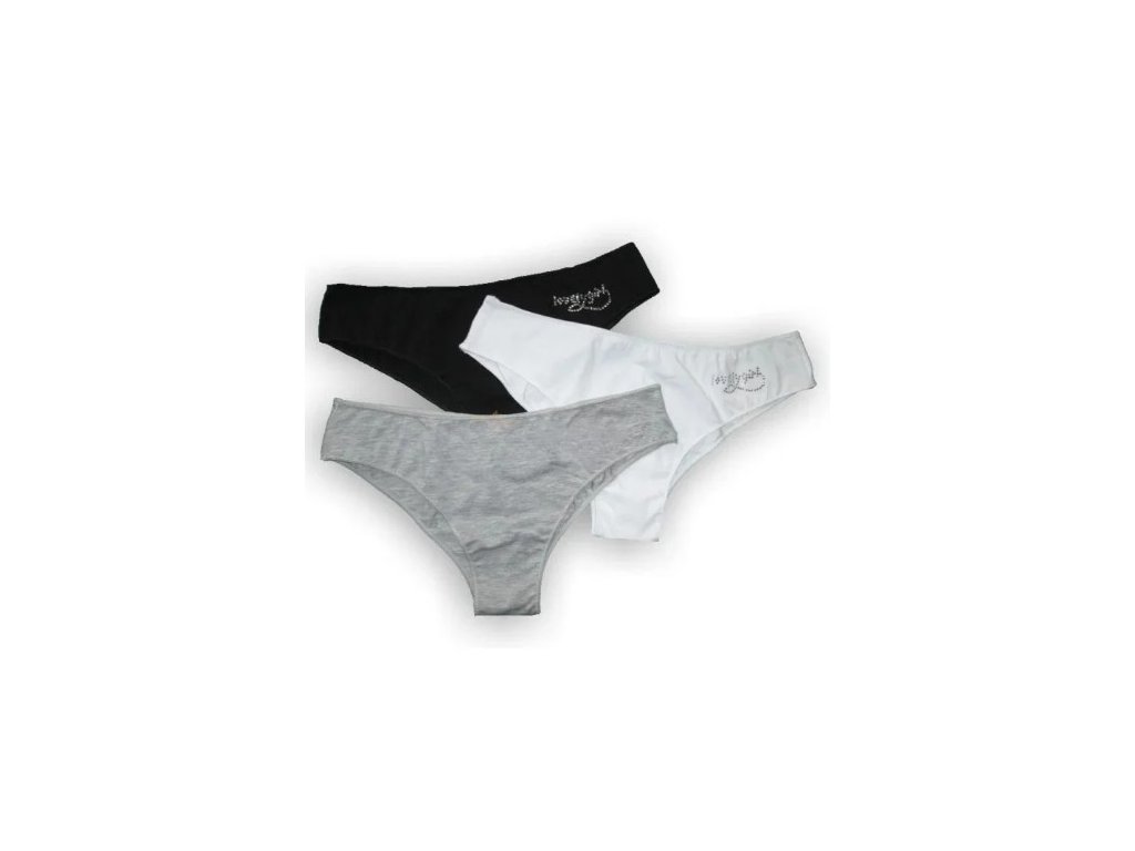Dámské brazilky značky Lovelygirl. Velmi oblíbené brazilky v bílé, šedé nebo černé barvě jsou vyrobeny z bavlny a modalu (přírodní vlákno v základu vyráběné z bukového dřeva, které dodává látce dokonalou pružnost, jemnost a hedvábný lesk, a ani při opakovaném praní kalhotky neztrácí tyto užitné vlastnosti). Vlákno modalu má dokonalou nasákavost a schopnost rychle odvádět pot od povrchu těla, což oceníte při celodenním nošení. V přední části mají brazilky nažehlené blyštivé kamínky loga LOVELYGIRL. Zadní část kalhotek je prostřižena a dokonale sedí na zadečku. Uvnitř kalhotek je vsazen bavlněný klínek. Kalhotky jsou na dotek hladké a velmi příjemné.