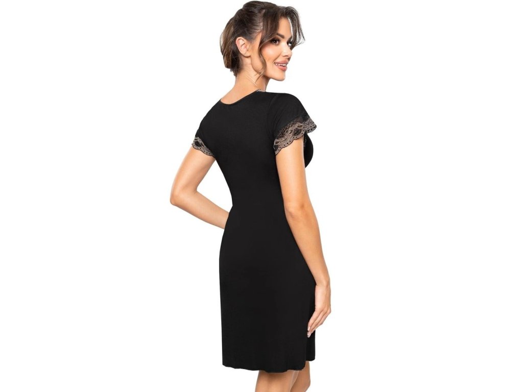 Elegantní dámská noční košile s krátkým rukávem, která je vyrobená z viskózy. Noční košile zdůrazňuje harmonii ženské postavy a zajišťuje maximální pohodlí. Klasický střih, jemně objímající tělo. Noční košile má výstřih ve tvaru V, ukončený ozdobnou krajkou s nepravidelným okrajem. Rukávy krátké délky, na konci zakončené prolamovanou krajkou. Jemná gumička pod poprsím, která pěkně odhaluje křivky. Noční košile s délkou nad kolena. Pokud má být noční spodní prádlo perfektní, tak bude tato volba ideální v každém případě.