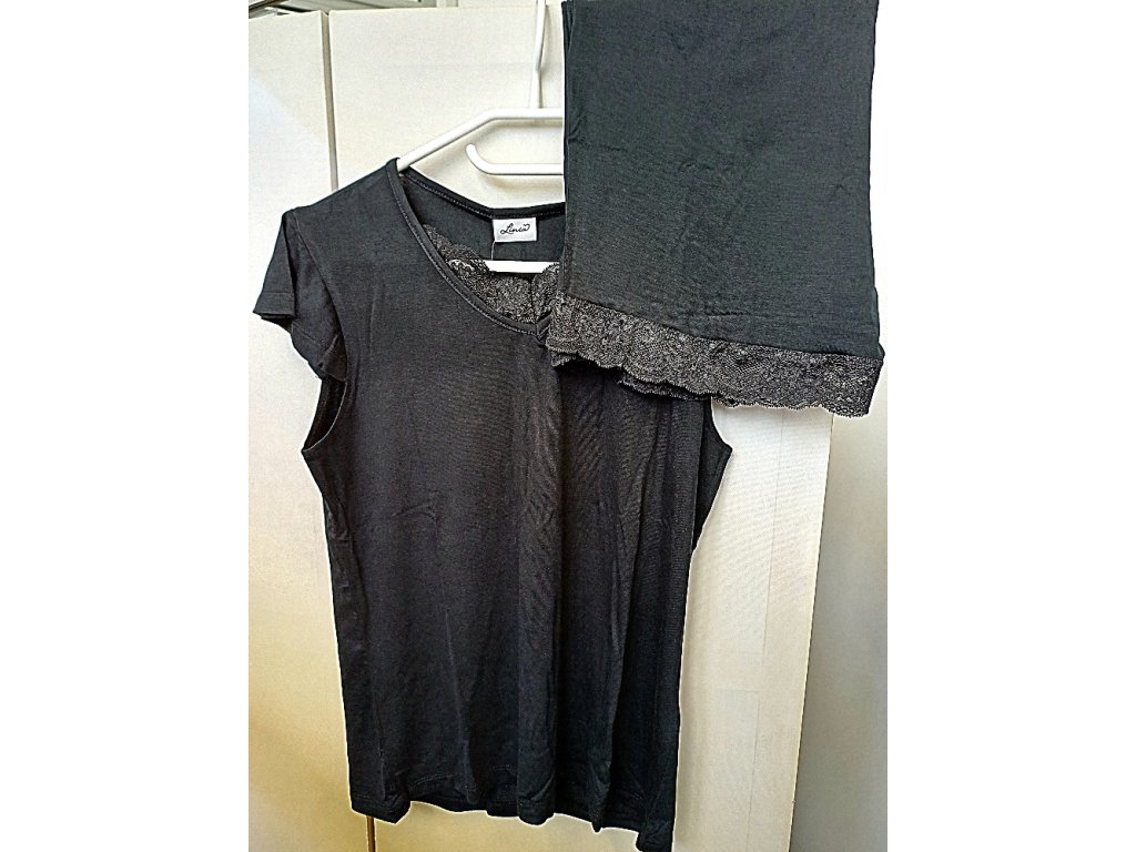Dámské pyžamo z lehkého materiálu s krátkým rukávem a kraťásky. Vrchní díl má lodičkový střih rukávů a výstřih zdobený jemnou krajkou. Kraťásky jsou po okrajích lemované krajkou, která dodává celému kompletu ženský a romantický vzhled.