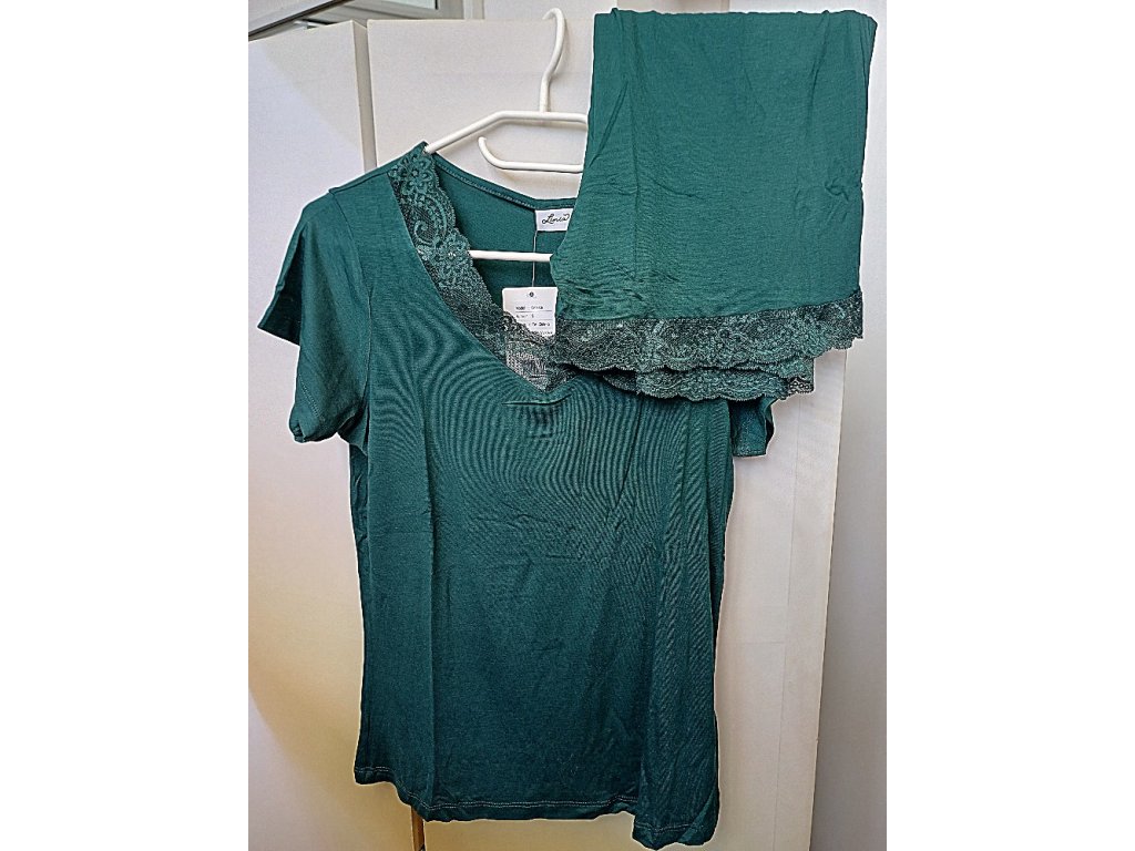 Dámské pyžamo z příjemné viskózy v zelené barvě s krátkým rukávem a šortkami. Vrchní díl má výstřih do V lemovaný jemnou krajkou, která dodává modelu ženský půvab. Krátké kalhoty jsou pohodlného střihu a kolem nohaviček ozdobené krajkou pro elegantní vzhled.