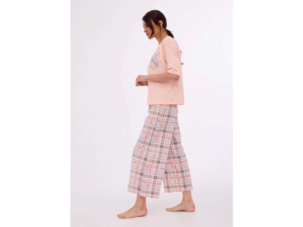 Tato jedinečná dámská pyžamová souprava s volnou halenkou ve světle růžové barvě je dokonalou kombinací pohodlí a decentního šarmu. Volný střih zajišťuje volnost pohybu a pohodlí. 3/4 rukávy dodávají eleganci a decentnost. Růžová barva jí dodává svěží a dívčí vzhled. Klasické kostkované kalhoty mají široký střih a 7/8 délku, což zajišťuje volnost pohybu a pohodlí a zároveň dodává módní vzhled. Díky atraktivnímu designu a funkčnosti je tato pyžamová souprava perfektní volbou pro večerní relaxaci a dobrý noční spánek.