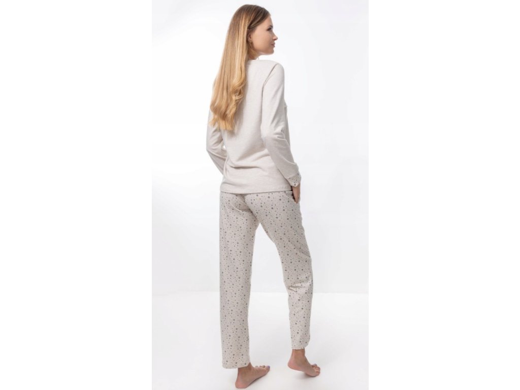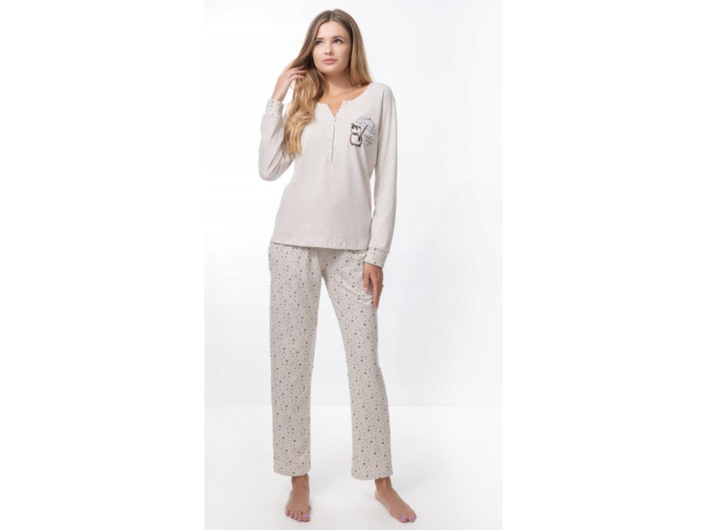 Dámské pyžamo s jemným vzorem na kalhotách rovného střihu. Vrchní díl zdobí tři malé knoflíky a decentní obrázek na přední straně, který dodává pyžamu půvabný a ženský vzhled.
