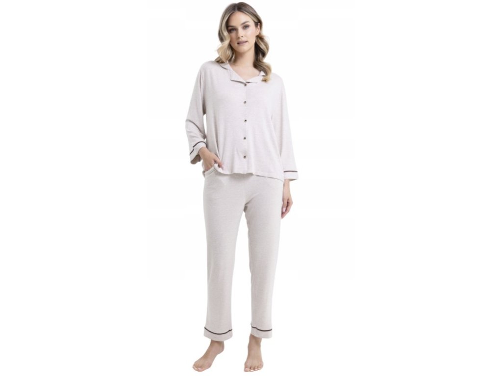 Pyžamo v elegantní cappuccino barvě s propínacím kabátkem a klasickým límečkem. Kalhoty jsou v rovném, pohodlném střihu – ideální volba pro stylový a komfortní odpočinek.