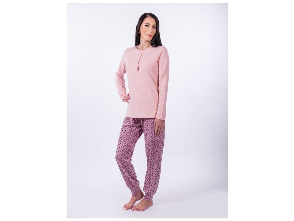 Dopřejte si dokonalý komfort s dámským pyžamem NELY, které spojuje pohodlí a elegantní styl. Toto pyžamo je vyrobené z příjemného bavlněného materiálu (95% bavlna, 5% elastan), který zajišťuje prodyšnost a jemnost na dotek. Dlouhé rukávy a volné kalhoty s jemným vzorem poskytují ideální pohodlí na chladnější večery i lenošení během dne. Díky elegantnímu růžovému designu se v něm budete cítit skvěle i při domácím odpočinku. Vyberte si svou velikost a užijte si večerní relaxaci v pyžamu NELY!