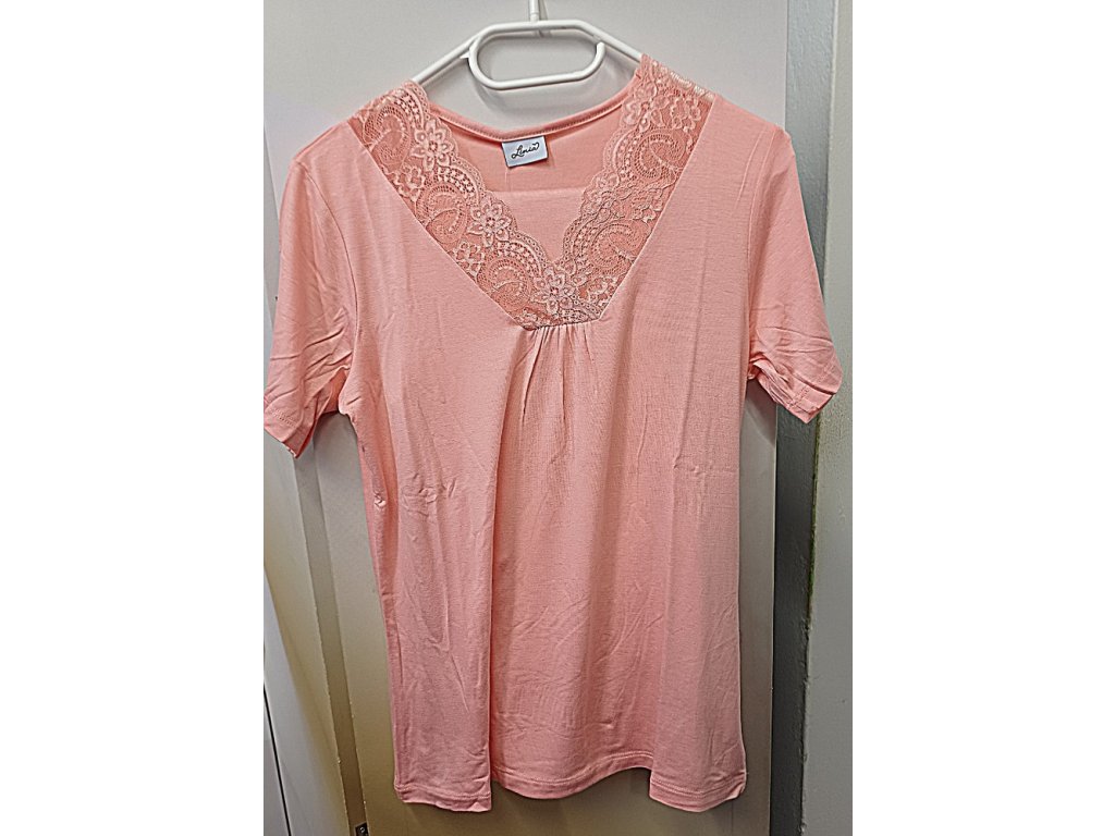 Dámské pyžamo z příjemné viskózy v růžové barvě působí jemně a elegantně. Vrchní díl s krátkým rukávem má výstřih do V lemovaný jemnou krajkou. Kalhoty jsou pohodlného střihu s praktickými kapsami. Pyžamo je bez potisku, ideální pro milovnice jednoduché elegance a pohodlí.